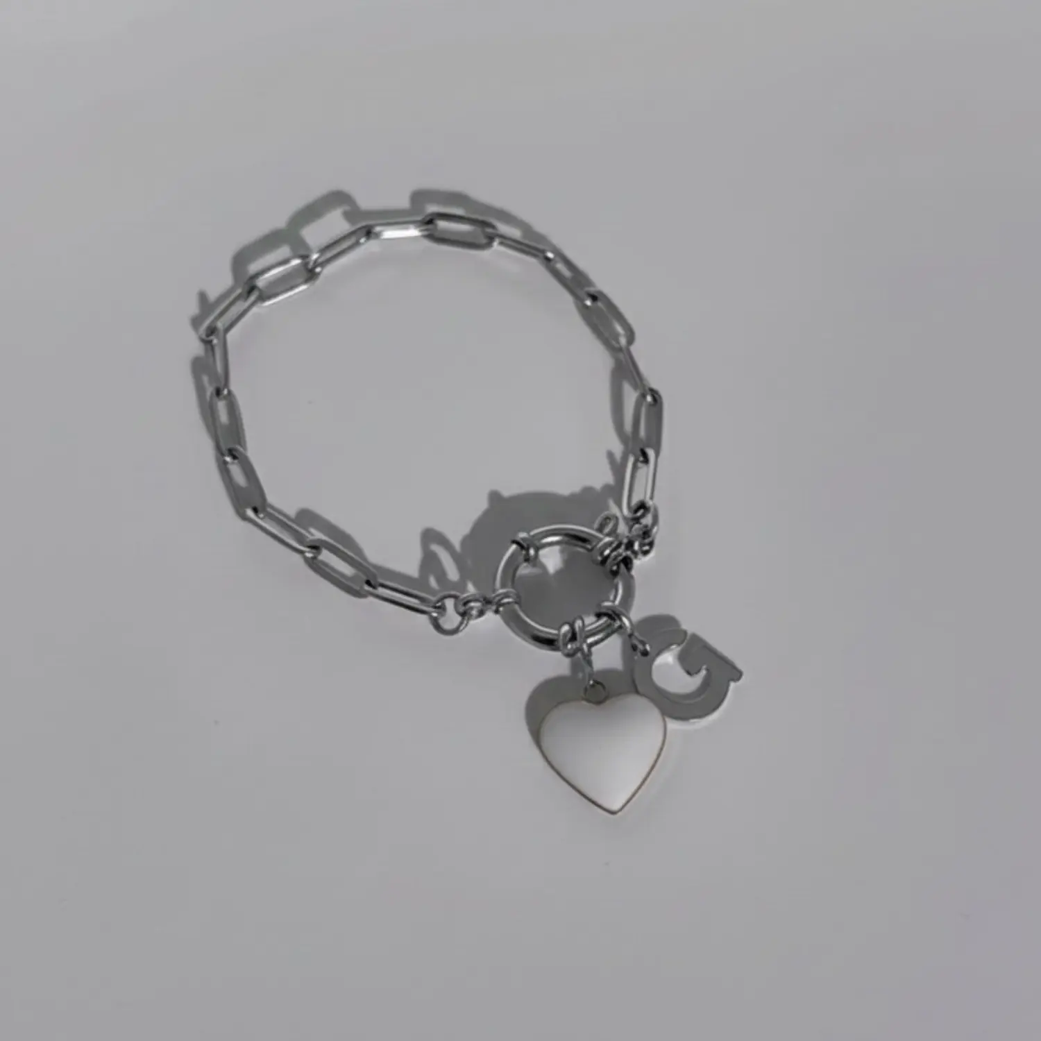 • bracelet connecté en acier argenté avec charm coeur blanc et charm initial