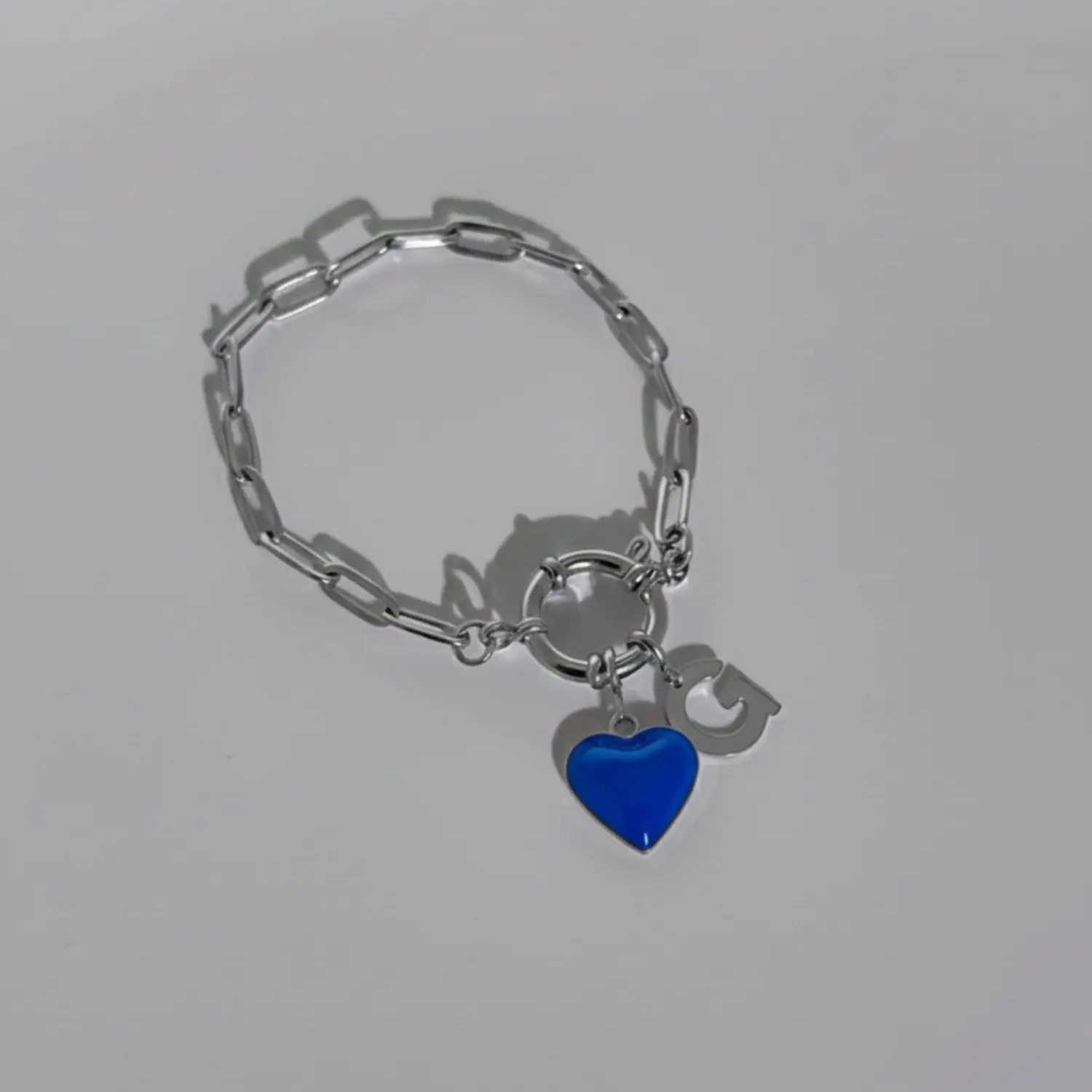 • bracelet connecté en acier argenté avec charm coeur bleu et charm initial